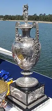 The trophy was donated in 1893 by Old Blues of the Universities of Oxford and Cambridge.[1] The original boat race was conducted over a 'Thames Putney Mortlake' equivalent course, which varied between 2 miles and 3+1⁄2 miles depending on location and conditions.