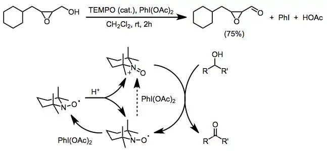 Oxoammonium-catalyzed oxidation reactions involve the conversion of organic substrates to more highly oxidized materials through the action of an N-oxoammonium species. Nitroxides may also be used in catalytic amounts in the presence of a stoichiometric amount of a terminal oxidant.[1] Nitroxide radical species used are either 2,2,6,6-tetramethylpiperidine-1-oxyl (TEMPO) or derivatives thereof.