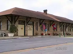 The Missouri-Pacific Depot, Ozark, now the Ozark Area Depot Museum, is a historic railroad station and museum at 1st and River Streets in Ozark, Arkansas. It is a roughly rectangular stone structure with a hip roof, standing between River Street and the railroad tracks. On its southern (rail-facing) side a telegrapher's booth projects. The roof has broad eaves extending around the building, supported by large Craftsman-style knee braces, and with exposed rafters visible. The station was built in 1910 by the Missouri-Pacific Railroad, and is notable for its association with the economically important railroad, and for its fine Craftsman architecture.[2] It is now a local history museum.