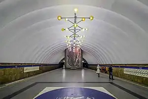 It is a single-vault station, at a depth of 59 metres (194 ft). The underground hall is decorated with marble, granite and diabase in warm orange tones, and mosaic pictures on the theme of nature. Three escalators are at the northern end of the station.
