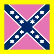 After Bull Run, Beauregard advocated the use of a standardized battle flag other than the "Stars and Bars" Confederate national flag to avoid visual confusion with the U.S. flag.[37] He worked with Johnston and William Porcher Miles to create the Confederate Battle Flag. Women visiting Beauregard's army contributed silk material from their dresses to create the first three flags, for Beauregard, Johnston, and Earl Van Dorn; thus, the first flags contained more feminine pink than martial red.[38] However, the official battle flag had a red background with white stars.[39] Throughout his career, Beauregard worked to have the flag adopted, and he helped to make it the most popular symbol of the Confederacy.[40]