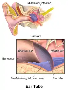 Inserting grommets is a common surgical procedure for treating children around the world.[1] Grommets are most commonly used to help improve hearing for children who have a condition commonly called "glue ear" (persistent otitis media with effusion) in both ears, and for preventing ear infections in children who have frequent middle ear infections.[1] Grommets are temporary and often fall out after 12–14 months as the ear heals.[2] Guidelines state that tubes are an option in: