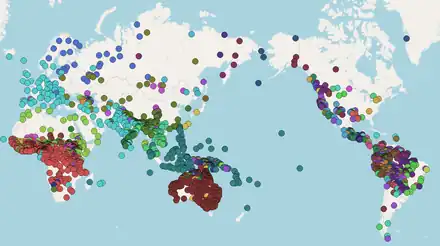 The languages are classified by family, geographical coordinates and world regions (Africa, North and South America, Australia, Eurasia and Papunesia).