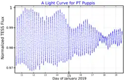 PT Puppis (PT Pup) is a star in the constellation Puppis. Anamarija Stankov confirmed this star as a Beta Cephei variable.[5] Analysis of its spectrum and allowing for extinction gives a mass 7.94 times that of the Sun, a surface temperature of 19,400 K and luminosity of 6405 Suns.[4]