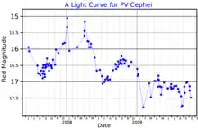 - 1 2 3 Kun, M.; Szegedi-Elek, E.; Moór, A.; Kóspál, Á.; Ábrahám, P.; Apai, D.; Kiss, Z. T.; Klagyivik, P.; Magakian, T. Yu.; Mező, Gy.; Movsessian, T. A.; Pál, A.; Rácz, M.; Rogers, J. (2011). "Inner disc rearrangement revealed by dramatic brightness variations in the young star PV Cep". Monthly Notices of the Royal Astronomical Society. 413 (4): 2689. arXiv:1101.2329. Bibcode:2011MNRAS.413.2689K. doi:10.1111/j.1365-2966.2011.18341.x. S2CID 118623750.