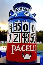 Pacelli's biggest rival is Brookstone High School, located in North Columbus (8 miles (13 km) north of Pacelli's Midtown campus). Although Pacelli plays Brookstone in all of their sports, the most popular rivalry is their yearly football game, dubbed the "Battle for the Jug".[17][18] The winner of this game gets to keep the "Broocelli Jug" (a milk jug painted red and blue) at their campus for the next year, along with bragging rights. In 2013, Pacelli received the jug for the first time since 2004 in a 14–7 win.[19] The rivalry first began in 1972, and Brookstone leads the series 27–17–1.[20]