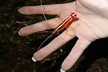 Lysmata amboinensis is an omnivorous shrimp species known by several common names including the Pacific cleaner shrimp. It is considered a cleaner shrimp as eating parasites and dead tissue from fish makes up a large part of its diet.[2][3] The species is a natural part of the coral reef ecosystem and is widespread across the tropics typically living at depths of 5–40 metres (16–131 ft).[3]