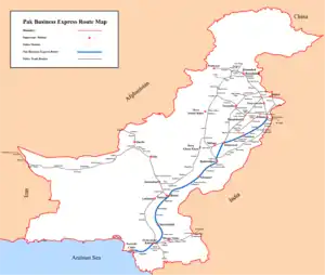 The Pak Business Express (Urdu: پاک کاروبار اکسپريس ), often abbreviated as Business Express, is a daily express train service between in Pakistan between the cities of Karachi and Lahore, which is one of the busiest routes in the country.[1] It was inaugurated by the then Prime Minister Yusuf Raza Gilani on 4 January 2012.[2][3][4][5]
