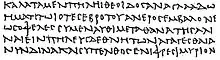 The view that the art of writing in India developed gradually, as in other areas of the world, by going through the stages of pictographic, ideographic and transitional phases of the phonetic script, which in turn developed into syllabic and alphabetic scripts was challenged by Falk and others in the early 1990s.[25] In the new paradigm, Indian alphabetic writing, called Brāhmī, was discontinuous with earlier, undeciphered, glyphs, and was invented specifically by King Ashoka for application in his royal edicts, around 250 BC. In the subcontinent, Kharoṣṭhī (clearly derived from the Aramaic alphabet) was used at the same time in the northwest, next to Brāhmī (at least influenced by Aramaic) elsewhere. In addition, the Greek alphabet were also added to the Indian context after its penetration in the early centuries of the Common Era (CE), with the Arabic alphabet following in the 13th century. After a lapse of a few centuries the Kharoṣṭhī script became obsolete; the Greek script in India went through a similar fate and disappeared. But the Brāhmī and Arabic scripts endured for a much longer period. Moreover, there was a change and development in the Brāhmī script which may be traced in time and space through the Maurya, Kuṣāṇa, Gupta and early medieval periods. The present-day Nāgarī script is derived from Brāhmī. The Brāhmī is also the ancestral script of most other Indian scripts, in northern and southern South Asia. Legends and inscriptions in Brāhmī are engraved upon leather, wood, terracotta, ivory, stone, copper, bronze, silver and gold. Arabic got an important place, particularly in the royalty, during the medieval period and it provides rich material for history writing.[26] The decipherment and subsequent development of Indus glyphs is also a matter for continuing research and discussion.