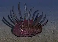 | Dinomischus | non-applicable | non-applicable | 13 specimens | This cup shaped creature has been in the center of debate since its description in 1977. It sat on the ocean floor with a long stalk, and a small holdfast and was a filter feeder. Recent studies have suggested that it is likely stem-group ctenophoran.[21] | ![]() | |