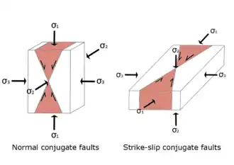 Anderson[6][7] was the first to utilize conjugate fault systems in interpreting paleostress, including all kinds of conjugate faults (normal, reverse and strike-slip). Regional conjugate fault can be better understood by comparison to a familiar rock mechanics experiment, i.e. the Uniaxial Compressive Strength (UCS) Test. Basics of their mechanisms are similar except the principal stress orientation applied is rotated from perpendicular to parallel to the ground. The conjugate fault model is a simple way to obtain approximate orientations of stress axes, due to the abundance of such structure in the upper brittle crust. Therefore, a number of studies have been carried out by other researchers in assorted structural settings and by correlating with other deformation structures.[8]