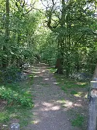 The woods are a mixed broadleaf woodland, composed primarily of oak which forms the main canopy, but includes for many other species such as rowan, maple, ash, and holly. There is also a varied shrub layer of elder, hazel, hawthorn, silver birch, and some cherry laurel. Other smaller shrubs and plants include for bramble, bracken, honeysuckle, broad buckler fern, nettle, ivy, and occasionally Raspberry.[1] Unfortunately Japanese Knotweed has been allowed to take hold in some parts of the site, and in other areas the brambles and nettles are becoming overly dominant.