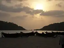 Palolem Beach is largely unspoiled and is inhabited by both local fishermen and by foreign tourists who live in shacks along the shore or in the main village itself.[1] It is about one mile (approximately 1.61 km) long and is crescent-shaped; one can view the entire beach from either end. Both ends of the beach consist of rocks jutting out into the sea. The depth of the sea increases gradually, being shallowest at the northern end of the beach, making it safe for average swimmers, and the currents are not fast.