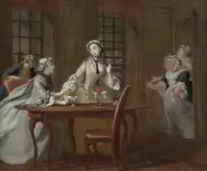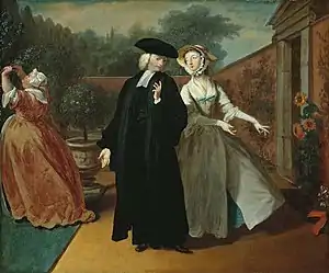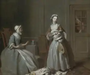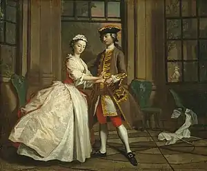 The series bears comparison with William Hogarth's contemporary series such as Marriage A-la-Mode, A Rake's Progress and A Harlot's Progress, also painted for the print market, but it differs from them in that they derive from a concrete literary source rather than the artist's plot-lines. Art historians see the Pamela series as placing Highmore alongside Hogarth and Hayman as "one of the initiators of a British school of narrative painting".[7] Though Highmore's paintings were intended as treatments of scenes from the novel rather than strictly as illustrations, Highmore and Richardson became close friends, with the former painting the latter's portrait as well as a scene from his later novel Clarissa.