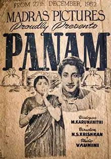 Panam (transl.Money) is a 1952 Indian Tamil-language film, directed by N. S. Krishnan. The film stars Sivaji Ganesan, N. S. Krishnan, B. R. Panthulu and Padmini. It was also the first of the many collbaborations between Ganesan and Padmini.[2][3]