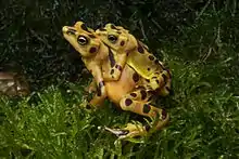 The lifespan of the Panamanian golden frog is 12 years.[12] This toad is unusual in that it communicates by a form of semaphore, waving at rivals and prospective mates, in addition to the sounds more usual among frogs. This adaptation is thought to have evolved in the Panamanian golden frog because of the noise of the fast-moving streams which formed its natural habitat.[8] The male tends to stay near the streams where breeding occurs, while in the nonbreeding season, the female retreats into the forests. The male uses a soft call to entice prospective mates, then grabs the female and hangs on when she crosses his path. If she is receptive, she will tolerate amplexus; if not, she will attempt to buck him off by arching her spine. Amplexus can last from a few days to a few months, with oviposition usually taking place in a shallow stream.[7]