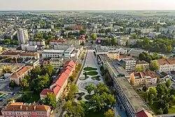 The city was severely damaged during the war with Moscow in 1654–1667 and the Great Northern War of 1700–1721, thus only 18 families lived in Old Panevėžys in 1720 and 90 families in New Panevėžys in 1738.[42] In the second half of the 18th century, Panevėžys, like many other small cities affected by the wars, consisted almost exclusively of wooden one-storey houses.[42] In 1727, on the western side of the New Panevėžys Square, the construction of the ensemble of the Piarists Monastery was started: the monastery building, the church and the college (to be rebuilt after the fire of 1790 with a Classicist style stone masonry church).[42][12][22] New buildings and the wooden synagogue built in 1794 did not change the city plan, but highlighted the city center, which had no striking accents in terms of size and spatial composition.[42] Of these buildings, only the church has survived to this day, while others were damaged during the World War II and were demolished in the post-war years.[42] The houses around the city's square highlighted its space, while the part of the city beyond the river (Old Panevėžys) had a typical rural view.[42]