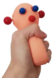 Later in 1985, Archie McPhee had started distributing the Obie design instead as The Popping Martian Doll, marketed as a stress toy and manufactured by a company named Aliko in Taiwan.[13][14] By 1988 the name was changed to the Martian Popping Thing, and by 1991 was redesigned so that the mouth was a nose and the toy resembled a clown.[15] This version was manufactured in Taiwan under that name until 2008 when it was then being distributed simultaneously by Schylling under the name Panic Pete[16] and in 2007 as Bug-Out Bob when being distributed by Toysmith[17] as well as the Popping Martian when being distributed by Tobar.[18]