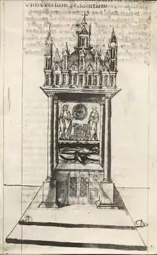 Very little is known about the placement and appearance of the original tombs: one of the most valuable accounts is that of church canon and historian Giacomo Grimaldi (a senator of Genoa and the father of Girolamo Grimaldi-Cavalleroni), who sketched the tombs as they were moved around the basilica on the way to their destruction;[4] Grimaldi's sketches record the shape and complexity of the early tombs, many of which were three-tiered.[2] A few destroyed papal tombs are also detailed in the writings of Alphonsus Ciacconius.[5]
