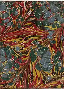 Paper marbling is a method of aqueous surface design, which can produce patterns similar to smooth marble or other kinds of stone.[1] The patterns are the result of color floated on either plain water or a viscous solution known as size, and then carefully transferred to an absorbent surface, such as paper or fabric. Through several centuries, people have applied marbled materials to a variety of surfaces. It is often employed as a writing surface for calligraphy, and especially book covers and endpapers in bookbinding and stationery. Part of its appeal is that each print is a unique monotype.