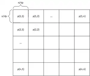 The basic idea to parallelize the algorithm is to partition the matrix and split the computation between the processes. Each process is assigned to a specific part of the matrix. A common way to achieve this is 2-D Block Mapping. Here the matrix is partitioned into squares of the same size and each square gets assigned to a process. For an -matrix and p processes each process calculates a sized part of the distance matrix. For processes each would get assigned to exactly one element of the matrix. Because of that the parallelization only scales to a maximum of processes. In the following we refer with to the process that is assigned to the square in the i-th row and the j-th column.
