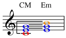 Contrast chord example Play: C major and E minor contrast through their respective notes C and B (in red and orange), each a half step apart or leading tones. The chords share two notes (in blue) however.