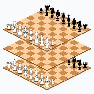 Parallel worlds chess is a three-dimensional chess variant invented by R. Wayne Schmittberger in the 1980s.[1][2][3] The gamespace comprises three 8×8 chessboards at different levels. Each side commands two full chess armies on levels 1 and 3. Level 2 begins empty and obeys its own move rules.