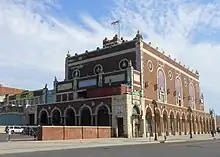 The Paramount Theatre in Asbury Park, New Jersey, Monmouth County, New Jersey, United States, is co-located with the Asbury Park Convention Hall on the boardwalk along the Atlantic Ocean. The two are connected by an arcade that spans the boardwalk, and is bordered by the Atlantic Ocean on the east, and Bradley Park on the west. A statue of Asbury Park founder James A. Bradley faces the buildings west facade.