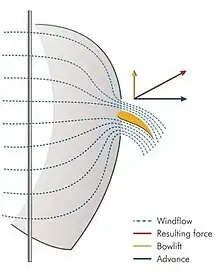 The Parasailor has a double-layer wing which inflates as the wind fills the sail. This acts like a soft batten, holding the sail out and actively re-opening the collapsed leech. The wing generates a lift that raises the bow of the boat, and also ensures that there is no loss of propulsion. Thanks to this lift, any yawing by the boat is prevented, making a much more comfortable ride. Even if the Parasailor has collapsed after a sudden strong wind shift, the spreading movement of the wing supports the re-opening once the wind has shifted back again.[3]