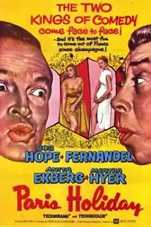 Paris Holiday is a 1958 American comedy film starring Bob Hope, which was directed by Gerd Oswald, and written by Edmund Beloin and Dean Riesner from a story by Hope. The film also features French comedian Fernandel, Anita Ekberg and Martha Hyer, and a rare appearance by writer/director Preston Sturges. The film was shot in Technirama and Technicolor in Paris and in the French village of Gambais.