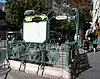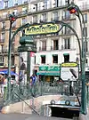 Rather than stone, Guimard used cast iron set in concrete both to reduce costs and to suit the sinuous Art Nouveau forms;[3][6] they were painted in a green emulating weathered brass.[7] (For a renovation that began in 1999, the RATP, the Paris transportation authority, restored the entrances to two slightly different shades: at sites with a lot of vegetation, vert wagon ('train-car green'), the dark green used for Parisian public works at the turn of the 20th century, and at fully urban sites, a slightly bluer shade, vert allemand ('German green').[8]) He designed standardized components, including railing cartouches incorporating the letter "M" and signs in his own distinctive lettering reading "Métropolitain" or, at narrow entrances, "Métro"; later the use of the lettering was extended to a holder for a system map and for advertising (porte-plan) with the station name above. In addition to speed (the first set of entrances were installed within six months of their design)[9] and relatively low cost in manufacture and adaptation to different sizes and locations of entrances, all of this gave the system a stylistic identity.[6][10]