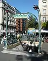 However, critics and many of the public were hostile to the libellules in particular, and criticized the green as "German" and the lettering as "un-French"[6] and, according to critic André Hallays in Le Temps, "confus[ing to] little children who are trying to learn their letters and ... stupefy[ing to] foreigners".[21] On the Champs-Élysées, for example at Marbeuf (now part of Franklin D. Roosevelt), simple stone walls with discreet carved signage were used instead,[10] and a plain design was also used at Bourse.[22][23] Unhappiness with Guimard's 1904 design for the Opéra station,[24] described in Le Figaro as having "contorted ramps" and "enormous frog-eye lamps",[25] and increasing costs led to the CMP severing its relationship with him.[5][22] The entrance at Opéra was instead designed by Joseph-Marie Cassien-Bernard, in classical marble.[22][25] The CMP bought Guimard's molds and rights[22] and a total of 141 of his entrances were ultimately produced, the last in 1913.[20]
