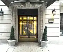 The building's limestone facade is accented by 2 tiers of balconies, the first at the second floor level, and the last on the uppermost (9th) floor. Additionally a juliet balcony hangs from the central window of the 8th floor. The wrought iron railings feature Greek key motifs in the corners.