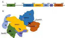 Like other members of the RING-between-RING (RBR) family of E3 ligases, parkin possesses two RING finger domains and an in-between-RING (IBR) region. RING1 forms the binding site for E2 Ub-conjugating enzyme while RING2 contains the catalytic cysteine residue (Cys431) that cleaves Ub off E2 and transiently binds it to E3 via a thioester bond.[8] Ub transfer is aided by neighbouring residues histidine His433, which accepts a proton from Cys431 to activate it, and glutamate Glu444, which is involved in autoubiquitination.[11] Together these form the catalytic triad, whose assembly is required for parkin activation.[12] Parkin also contains an N-terminal Ub-like domain (Ubl) for specific substrate recognition, a unique RING0 domain and a repressor (REP) region that tonically suppresses ligase activity.
