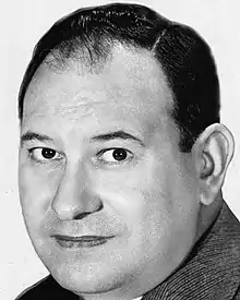 He suffered a fatal heart attack on Sunday, November 23, 1958, at age 54, during a roast in honor of actress/comedienne Lucille Ball and Desi Arnaz.[19][20] After Einstein delivered his monologue, emcee Art Linkletter remarked, "Every time he finishes, I ask myself, why isn't he on the air in a prime time?"[21] Einstein turned to Milton Berle, who was seated next to him on the dais, and said, "Yeah, how come?"—then slumped into his lap. Berle's shout of "Is there a doctor in the house?" was initially thought to be a humorous ad lib (the event was a charity benefit for local hospitals and several physicians were in attendance), but the gravity of the situation quickly became clear.[18]