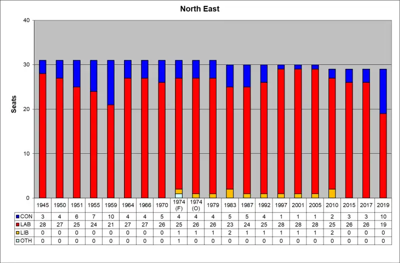 The region[1] of North East England is divided into 29 parliamentary constituencies which is made up of 19 borough constituencies and 10 county constituencies. Since the 2019 general election,[2] 17 are represented by Labour MPs and 11 by Conservative MPs. One is an independent.