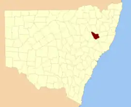 Parry County is one of the 141 Cadastral divisions of New South Wales. It is bounded by the Peel River and Cockburn River on the north, near Tamworth. The Moonbi Range is on the eastern boundary, and the Peel Range on the western boundary. The Great Dividing Range is the boundary to the south-east. It includes the towns of Dungowan, Ogunbil, Woolomin, Loomberah, Piallamore and Nundle.