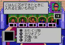 The game plays like a real Japanese television quiz programme that airs on Channel 13 and is hosted by Tiger Yakuto: five contestants compete against each other in rounds of various quiz modes,[2] and up to five players can play simultaneously using the Mega Drive's Multiplayer Adaptor.[3] In each mode, points are awarded for answering questions correctly, and deducted for answering incorrectly. Quiz modes include (although are not limited to) the Bet Quiz, where the contestants place bets before a question, and the Genre Selection Quiz, where a genre is chosen and a question of that genre is posed (each time a genre is selected, the point stake is increased). The programme features advert breaks during which Sega products are advertised.[4] The winner plays the Time Attack Quiz, where questions are answered within a time limit to "win" prizes.[5] There is also a free play mode where players can practise quiz types without playing in the programme.[4]