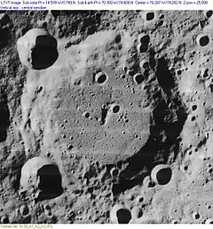 Just to the north of Pascal is Poncelet C, a satellite crater of the lava-flooded Poncelet to the east. The rim of this crater is bisected by several grooves in the surface, one of which crosses the southeast rim and cuts across tangentially to the northeastern rim of Pascal.