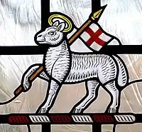 Paschal Lamb with the banner symbolising Christ's resurrection. Stained Glass, Anglican cathedral at Guildford, Surrey, England.
