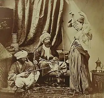Pasha and Bayadère is a black and white photograph by English photographer Roger Fenton, taken in 1858. It belongs to a group of pictures where Fenton staged scenes inspired by the Middle East exoticism and also by the artistic movement of orientalism.[1][2]