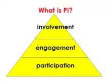 Public involvement (PI, formerly PPI, for Public and Patients' Involvement), in the context of health and care research, is the term for working with lay people (members of the general public, including patients and those close to them) as volunteers in influencing and shaping research.[1] It is a worldwide initiative to give the public an effective, active role in health and care research. The term "health and care" covers healthcare (medical care), public health, and social care. The purpose is to align research more closely with patients' and the public’s needs, skills and experience and thereby increase its success and cost-effectiveness.