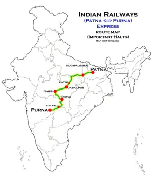 The Patna–Purna Express is an Express train belonging to South Central Railway zone that runs between Patna Junction and Purna Junction in India. It is currently being operated with 17609/17610 train numbers on a weekly basis.[1][2][3]