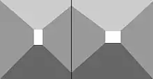 The picture surface of Vanishing Venice (above) is three-dimensional, made of two pyramids with their tops cut off protruding towards the viewer: the bases of the pyramids are farthest away (flat against the wall), while the flat tops (shown as the two lighter rectangles in the diagram, right) are those parts which are physically nearest to the viewer but which appear, in the picture, to be in the distance at the end of the buildings.
