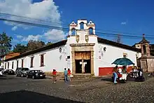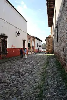 Facing the main plaza is the Palace of Huitziméngari. This structure, like most of the rest of the town, is made of adobe and has a clay tile roof.[6] This palace belonged to Antonio de Huitziméngari, the son of the last Purépecha cazonci (monarch), and the godson of the first viceroy of New Spain, Antonio de Mendoza.[12] It has two floors, a sober facade and the inner courtyard is surrounded with round arches and filled with flowers.[7][12] On the upper floor, there is a statue of a dog, an allusion to Huitziméngari's name which in Purépecha mythology referred to the dog that served the Lord of Paradise. The dog motif is repeated on some of the inside doors.[6]