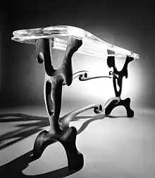 In 1948, László joined with George Nelson, Charles Eames and Isamu Noguchi to design for the Herman Miller company. The furniture lines presented by Herman Miller from 1948 have been called the most influential groups of furniture ever manufactured. Nevertheless, László was not pleased with the arrangement and the relationship ended in 1952. Starting in 1941 and continuing for over 25 years, László maintained his design studio at 362 North Rodeo Drive in Beverly Hills. László rented the entire building from the owner when it was still incomplete and he immediately took on the task of designing the interiors, the exterior details and all of the furniture complete with fabrics. The studio also had a small area showcasing his work and helped him achieve even greater prominence. He designed department stores for Bullock's Wilshire, Goldwaters, Robinson's,[4] Saks Fifth Avenue, Halls (Crown Center, Kansas City), Hudson's Bay and Ohrbach's.[5] Also, he designed many of the casinos and showrooms in the Howard Hughes-owned hotels in Las Vegas. László achieved further fame with his elegant bomb shelter designed for John D. Hertz.[6][7] He also conceived "Atomville,"[8] a futuristic underground city,[9][10] of which a later version was proposed in a letter to the U.S. Air Force.[11]