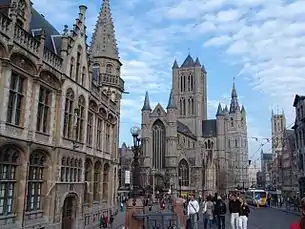 Ghent: hometown of Lebrun (from left: Old post office, Saint-Nicholas Church, Belfry, and Saint Bavo Cathedral).