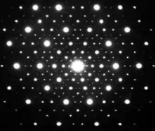 The electron diffraction pattern for icosahedrite, the first natural quasicrystal, obtained by aiming the electron beam down a fivefold axis of symmetry. The patterns correspond perfectly (up to experimental resolution) with the fivefold patterns first predicted by Paul Steinhardt and Dov Levine in the 1980s for an icosahedral quasicrystal.