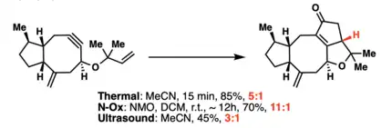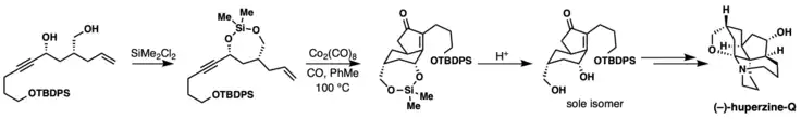 An example of a newer version is the use of the chlorodicarbonylrhodium(I) dimer, [(CO)2RhCl]2, in the synthesis of (+)-phorbol by Phil Baran. In addition to using a rhodium catalyst, this synthesis features an intramolecular cyclization that results in the normal 5-membered α,β-cyclopentenone as well as 7-membered ring.[43]