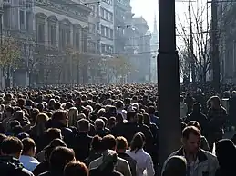 In 1997 Pavle took part in the massive anti-government protests in Belgrade. On 27 January (St Sava Day) he led the protesters to break the police cordon in Kolarčeva street. This was the first time that Pavle openly confronted Milošević's government. Although in following years he became close to the opposition leaders and confronted Milošević, Pavle took part in the 1999 Republic Day celebration where he congratulated Milošević. Pavle later apologized and said that it was misinterpreted. After this, the relations between Pavle and Milošević hit new lows. In 2000, Milošević didn't send Pavle Christmas congratulations for the first time. Pavle later called Milošević and his government responsible for the Yugoslav catastrophe and asked him to resign.[4] After the change of power in Serbia, Pavle continued to cooperate with the government, and was a frequent guest at various political ceremonies.